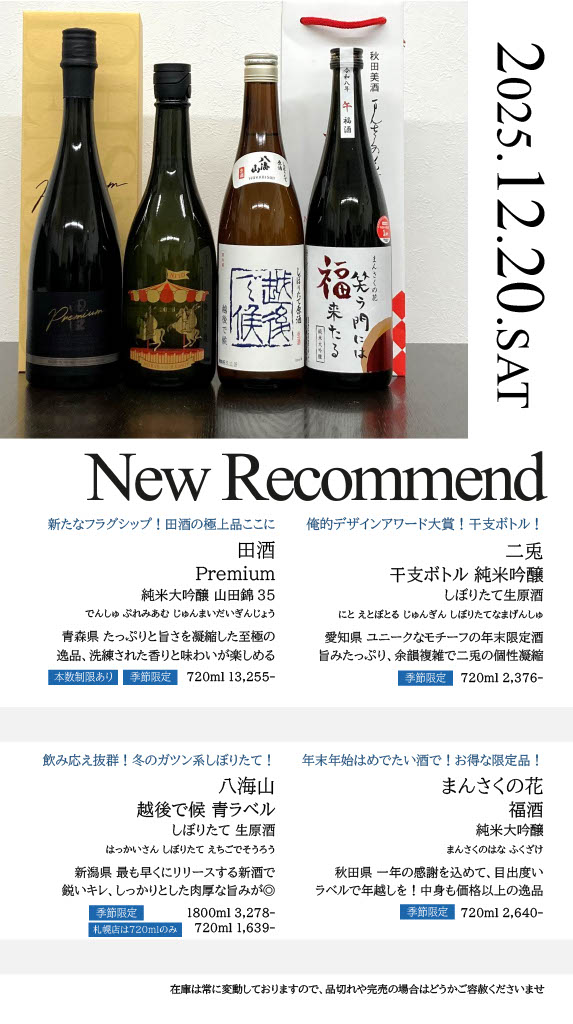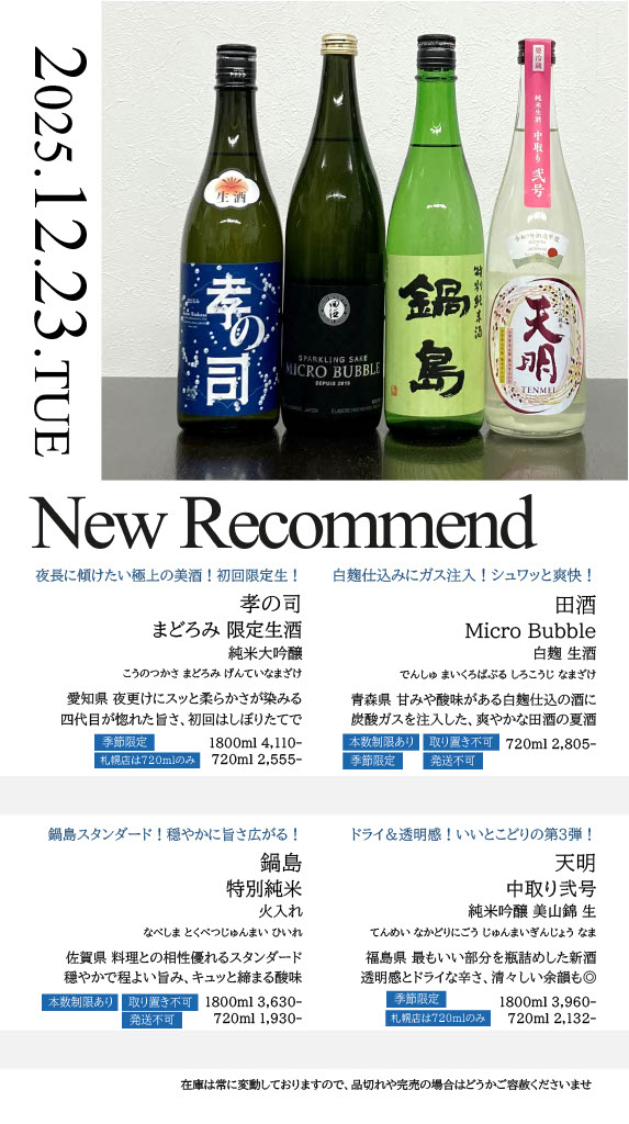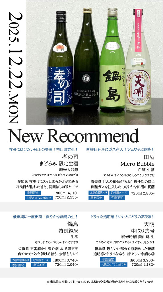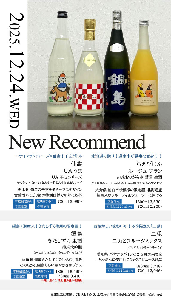 札幌店は狭小店舗のため一部の1.8Lサイズを除き、720mlサイズを中心としたラインナップとなっており、旭川店とは一部取り扱いが異なります。札幌店では「旭川店からの取り寄せ」が可能です。ご希望の商品やサイズがない場合、数日お時間をいただければ、札幌店でのお買い求めも可能となります。気軽にご相談くださいませ。