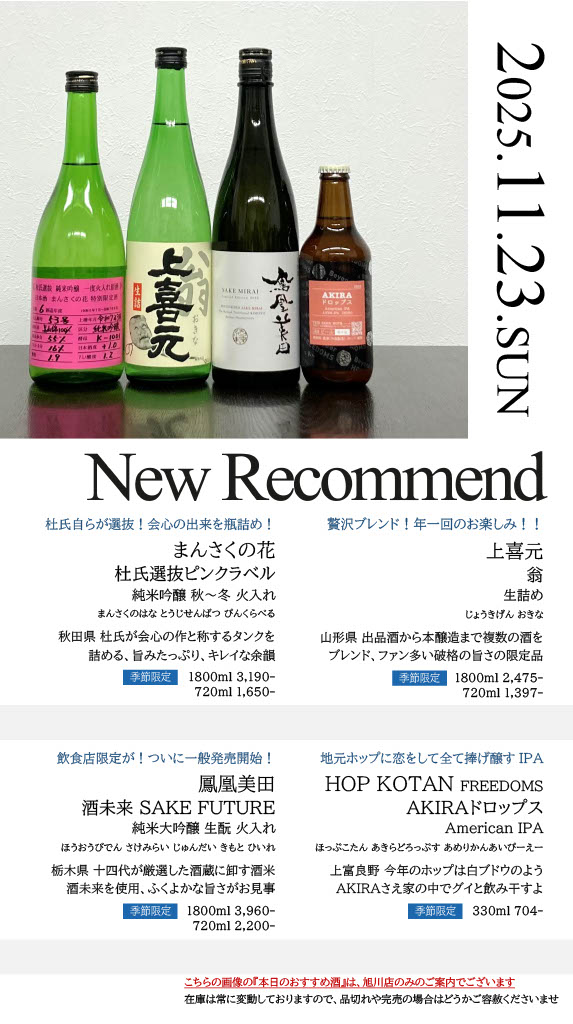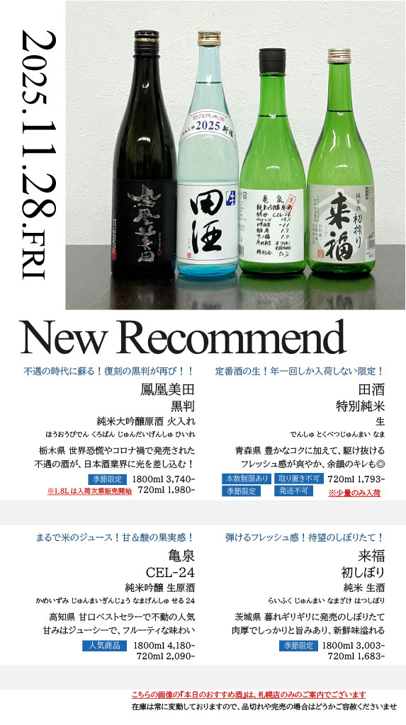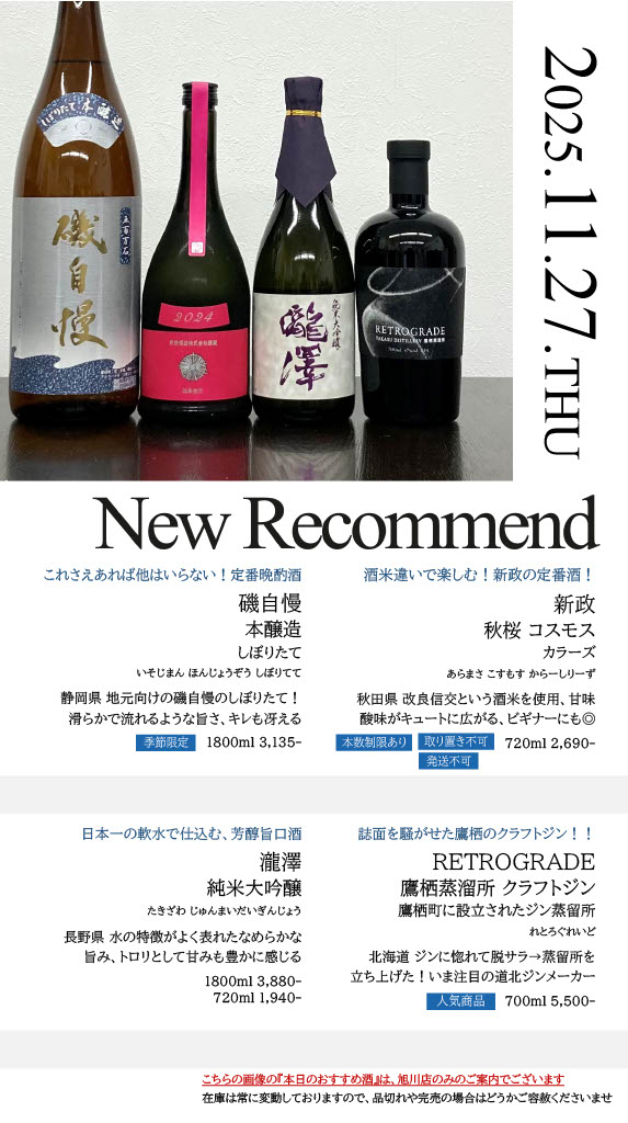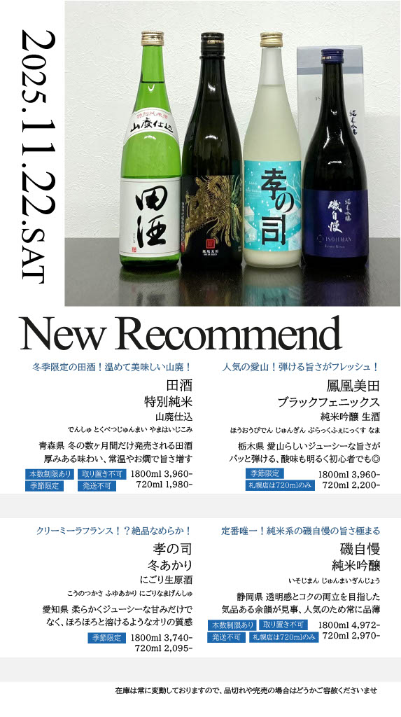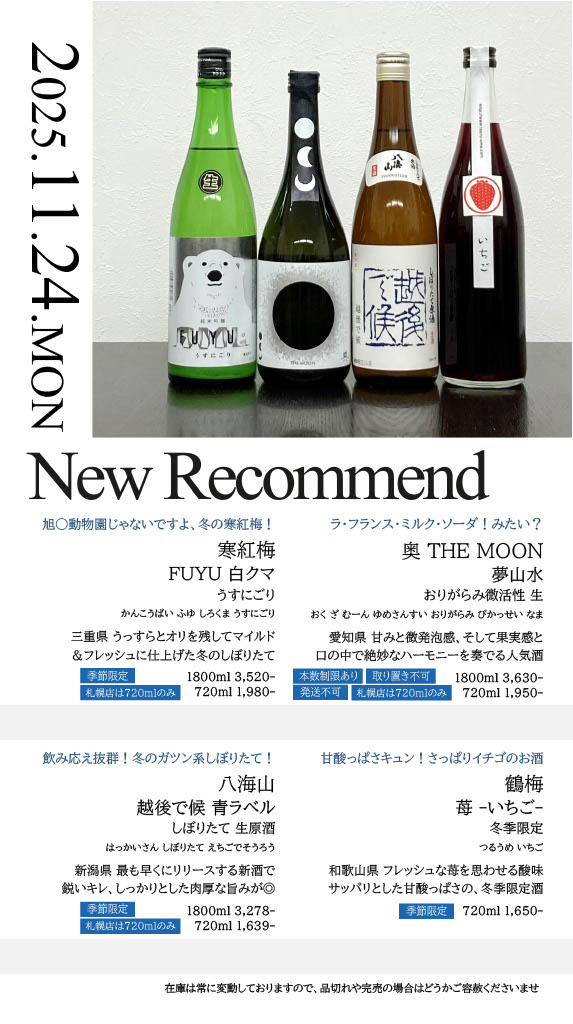 札幌店は狭小店舗のため一部の1.8Lサイズを除き、720mlサイズを中心としたラインナップとなっており、旭川店とは一部取り扱いが異なります。札幌店では「旭川店からの取り寄せ」が可能です。ご希望の商品やサイズがない場合、数日お時間をいただければ、札幌店でのお買い求めも可能となります。気軽にご相談くださいませ。