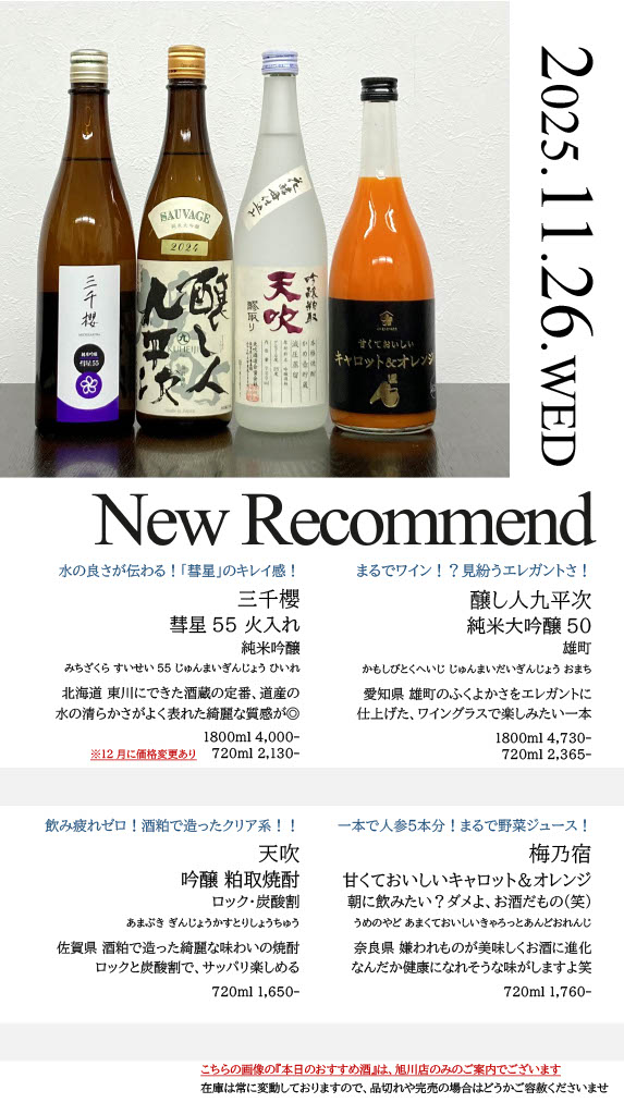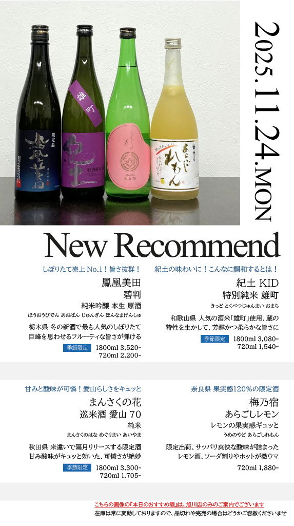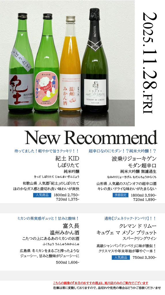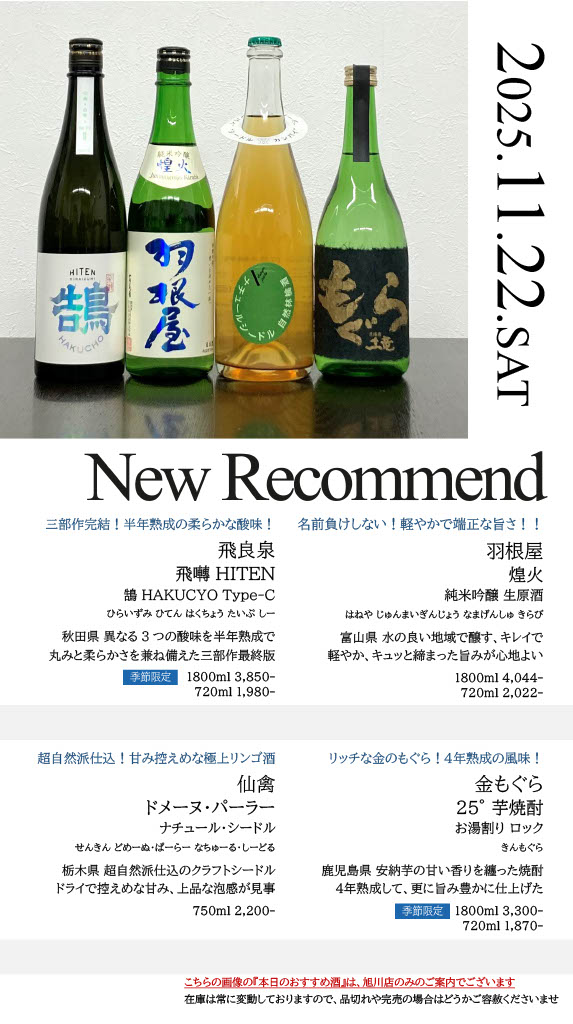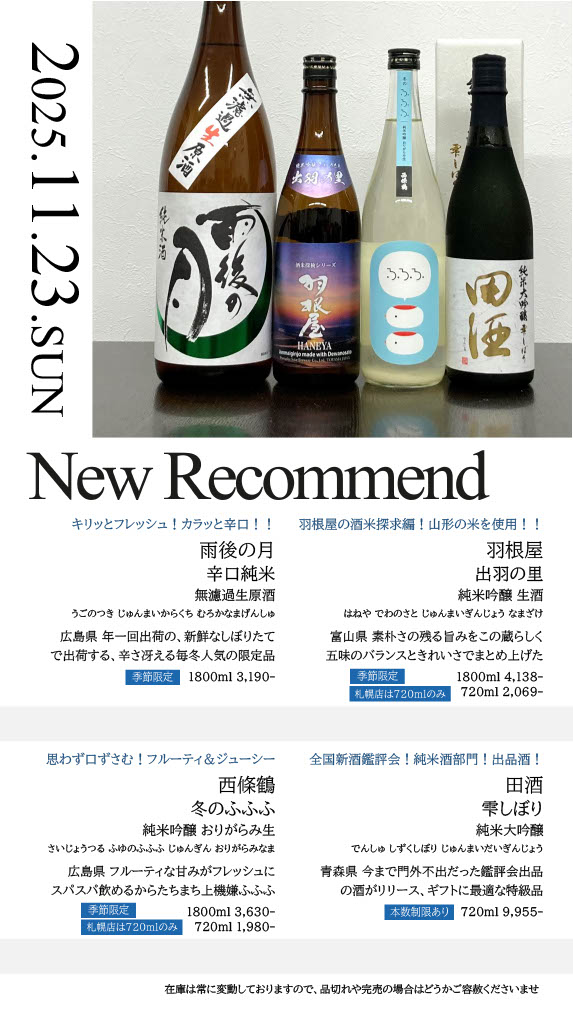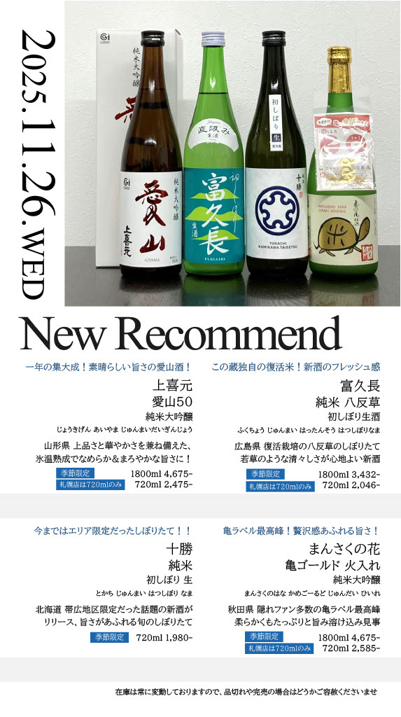 札幌店は狭小店舗のため一部の1.8Lサイズを除き、720mlサイズを中心としたラインナップとなっており、旭川店とは一部取り扱いが異なります。札幌店では「旭川店からの取り寄せ」が可能です。ご希望の商品やサイズがない場合、数日お時間をいただければ、札幌店でのお買い求めも可能となります。気軽にご相談くださいませ。