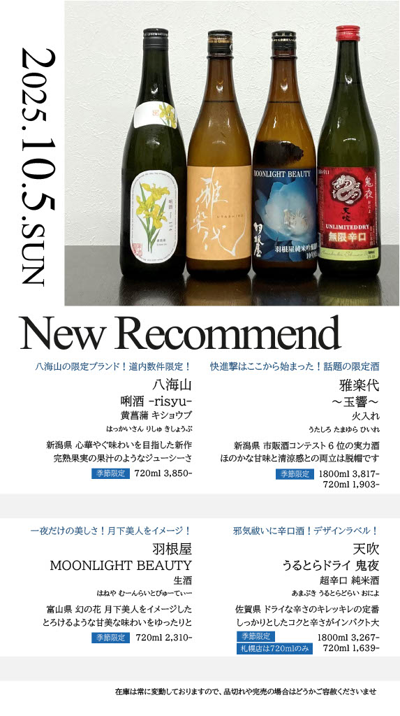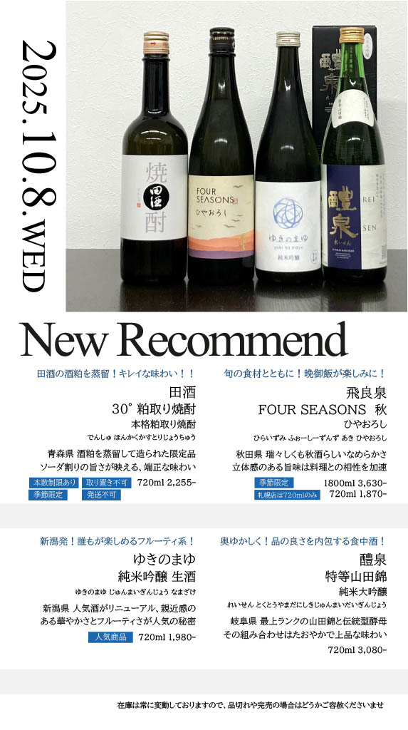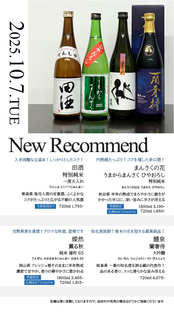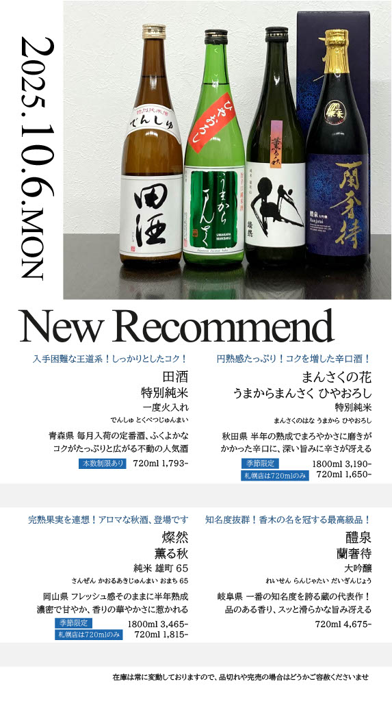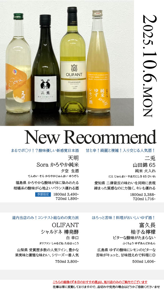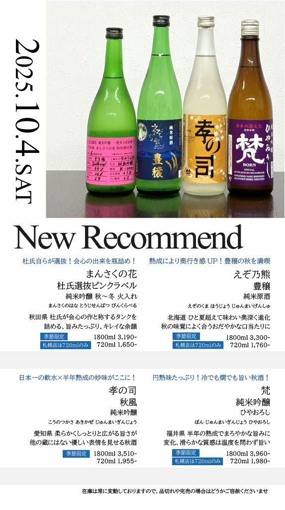 札幌店は狭小店舗のため720mlサイズを中心としたラインナップとなっており、旭川店とは一部取り扱いが異なります。札幌店では「旭川店からの取り寄せ」が可能です。ご希望の商品やサイズがない場合、数日お時間をいただければ、札幌店でのお買い求めも可能となります。気軽にご相談くださいませ。