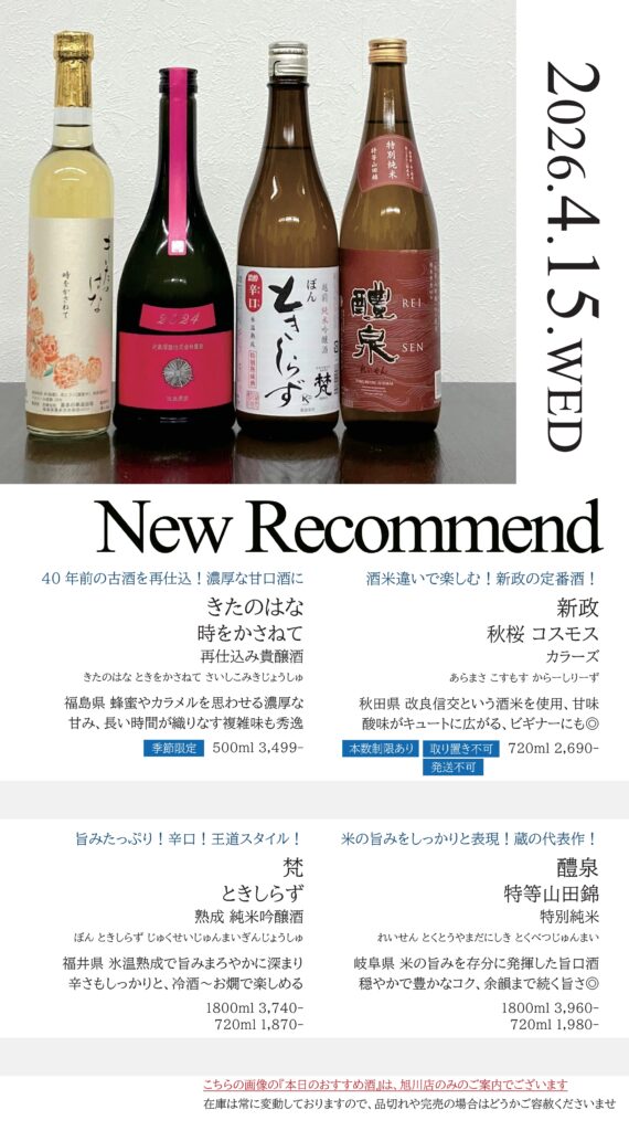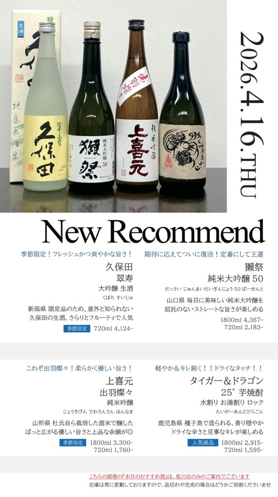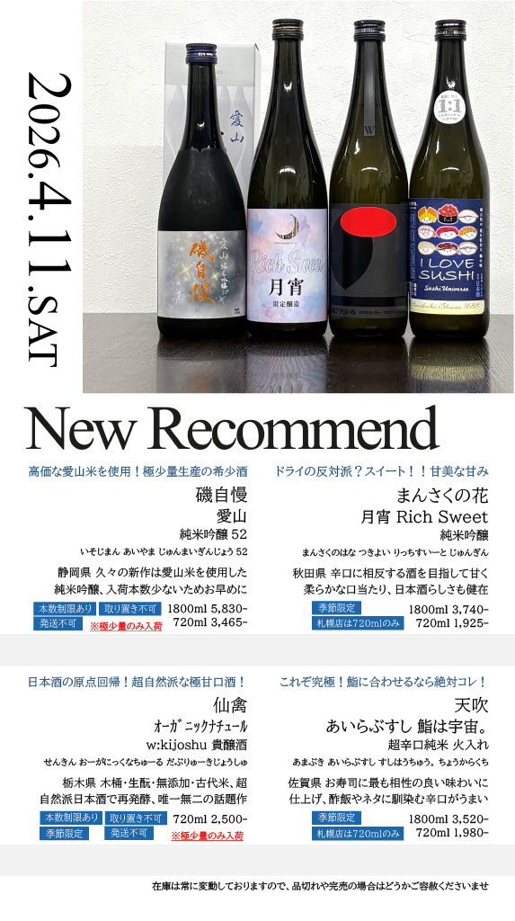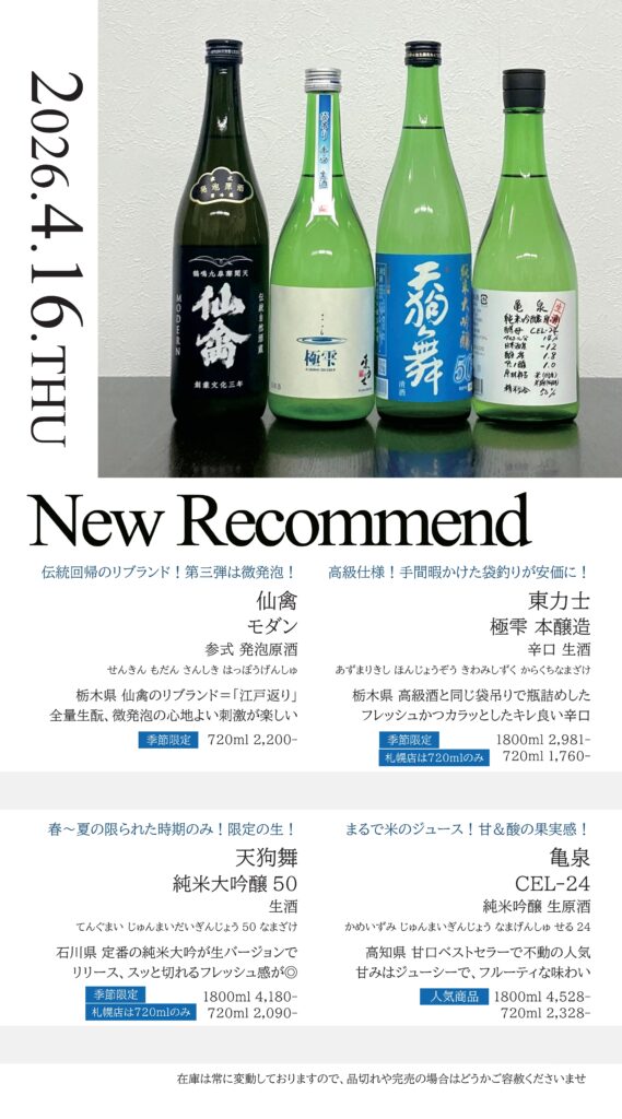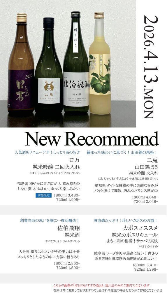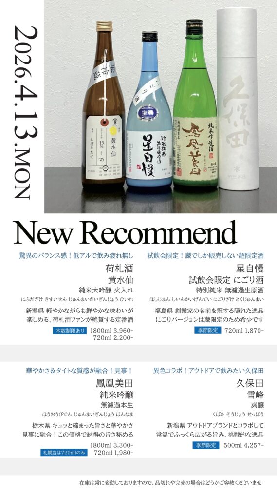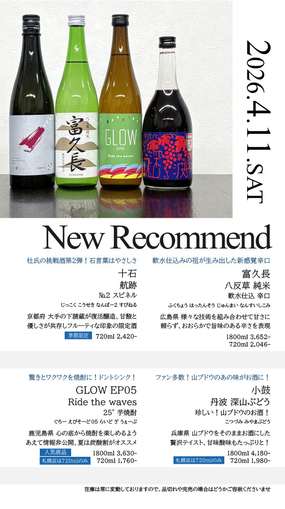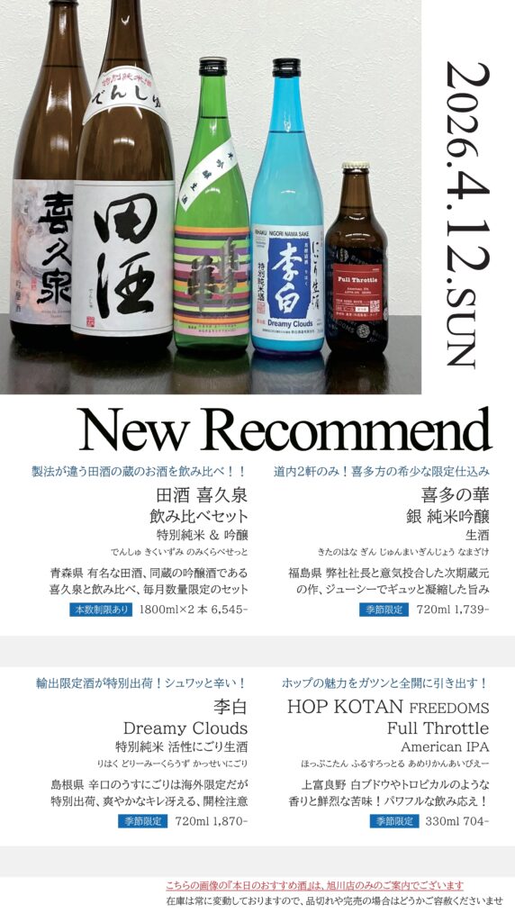 札幌店は狭小店舗のため一部の1.8Lサイズを除き、720mlサイズを中心としたラインナップとなっており、旭川店とは一部取り扱いが異なります。札幌店では「旭川店からの取り寄せ」が可能です。ご希望の商品やサイズがない場合、数日お時間をいただければ、札幌店でのお買い求めも可能となります。気軽にご相談くださいませ。